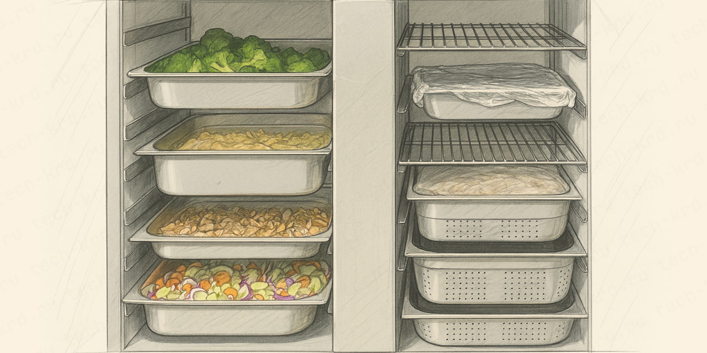 Воздух распространяют вентиляторы: температура ровная по всему объёму, шкаф быстро набирает холод после частых открытий. Минус есть: обдув подсушивает продукты, поэтому хранить продукты следует в закрытых гастроёмкостях или в упаковке.