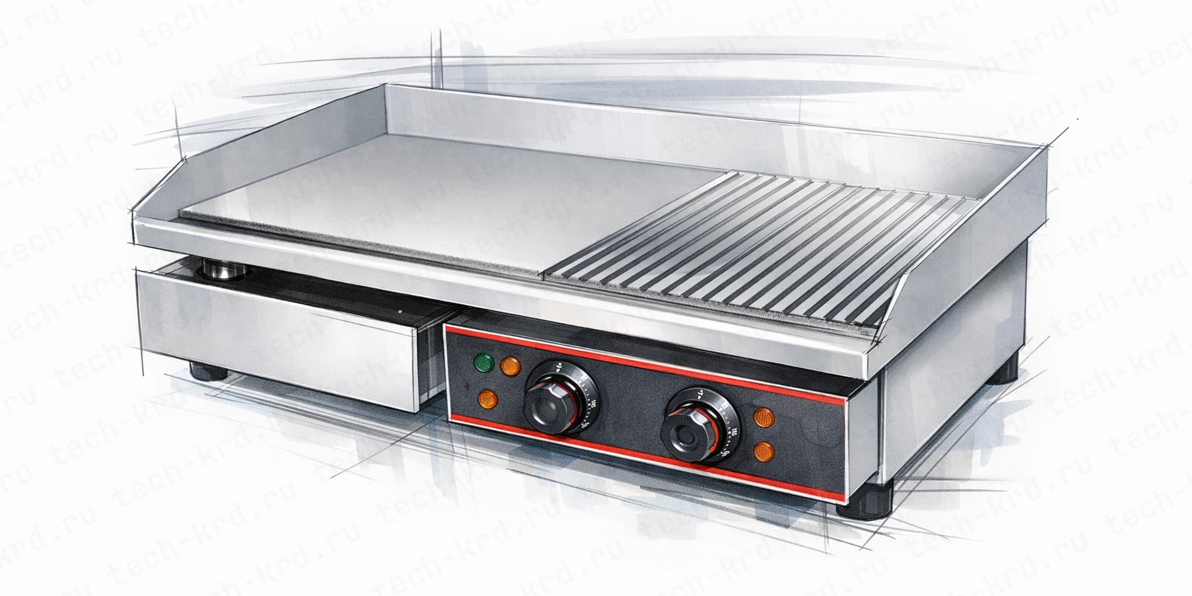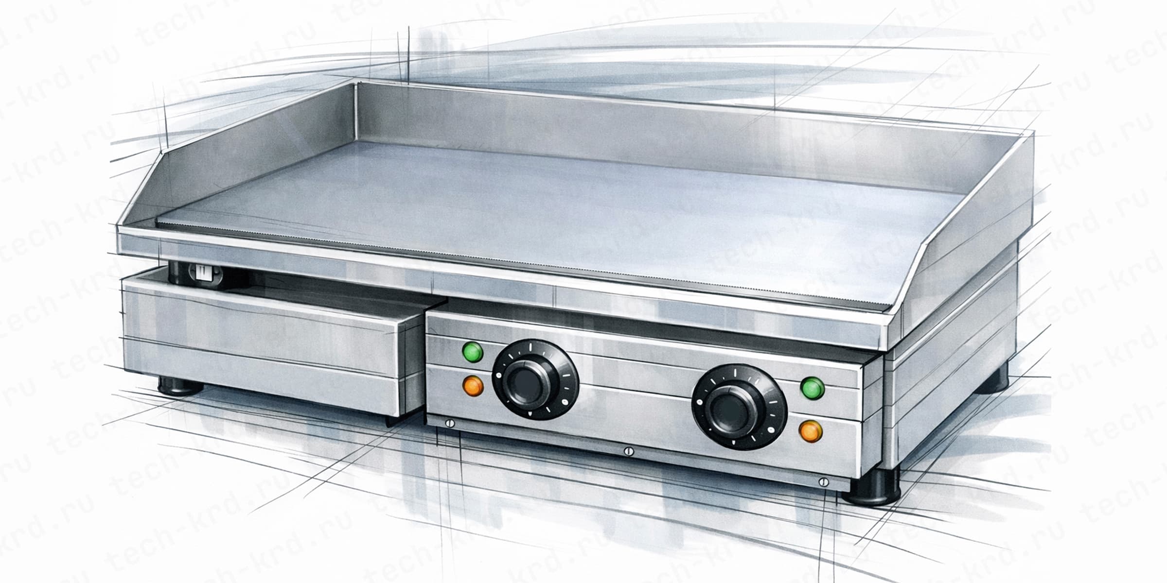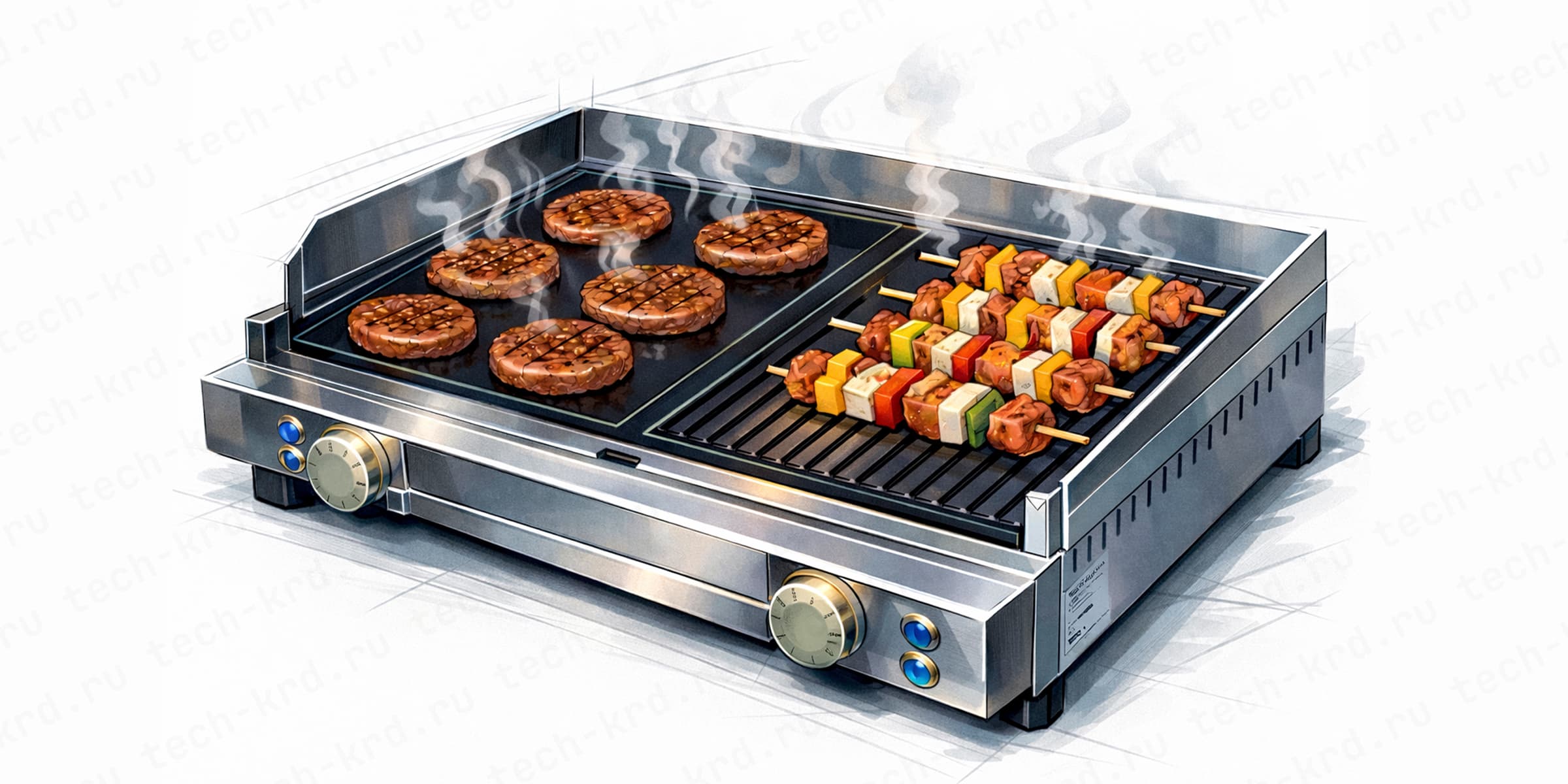 У многих жарочных поверхностей рабочая плита разделена на две или несколько зон, каждая со своим регулятором температуры. Это позволяет держать разные режимы одновременно: на одной части быстро обжаривать продукт, а на другой — доводить до готовности или поддерживать в тёплом состоянии.