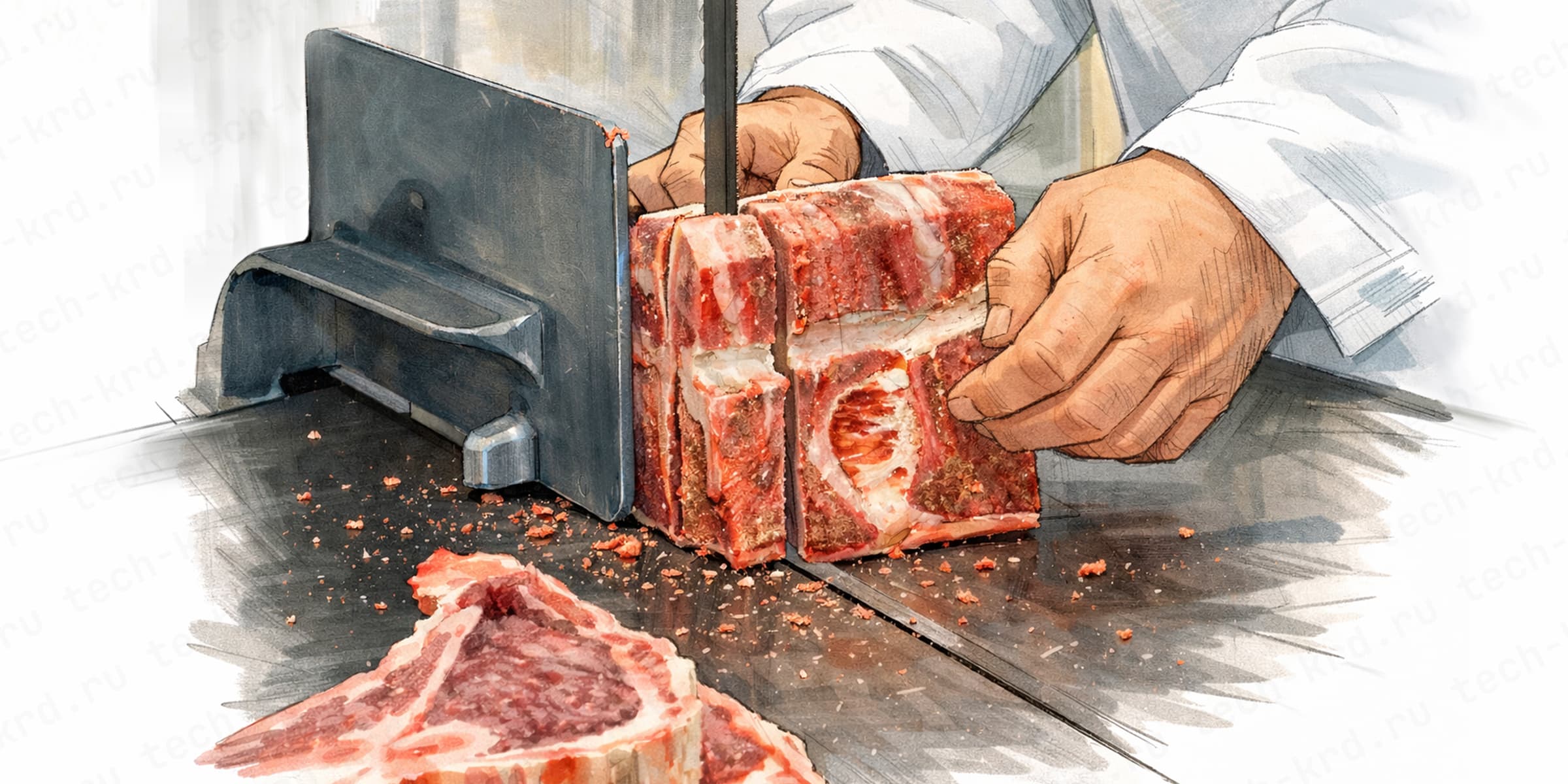 Это непрерывная зубчатая лента, которая делает рез. Для разных задач подбирают полотно по ширине и шагу зуба. Это влияет на скорость и качество распила туш и кусков.