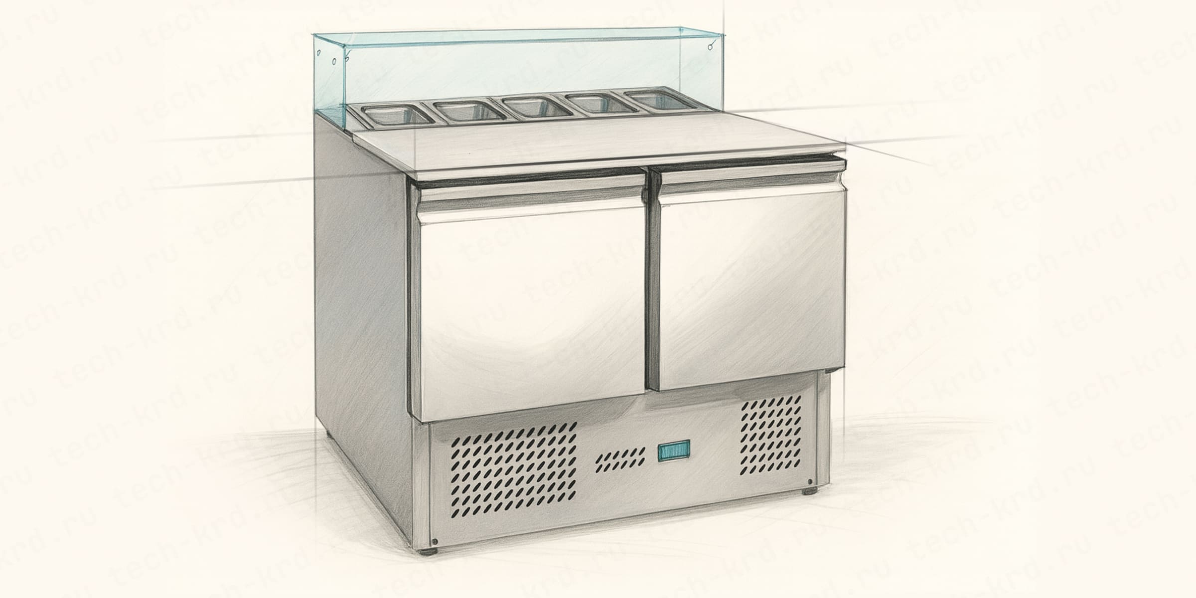 Сверху расположены места для гастроёмкостей (в них находятся овощи, соусы, сыр, мясные топпинги), снизу — охлаждаемые шкафы или выдвижные ящики с запасами.