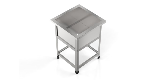 Стальная цельнотянутая ванна AISI 304; каркас разборный, уголок из оцинкованного металла, толщиной 1,5 мм; рабочая поверхность из нержавеющей стали AISI 304, толщиной 1 мм; плоский борт 70 мм; обвязка, 600 × 700 × 850 мм.