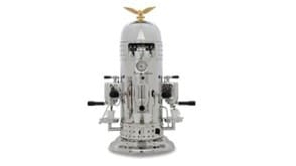 Кофемашина традиционная трехрожковая, полуавтомат предусматривает ручную дозацию, автоуровень воды, подачу пара и подачу кипятка. Остановка производится вручную, путем нажатия кнопки «stop». Объем бойлера - 14,8л. Цвет корпуса - хром. Кофемашина имеет вертикальную форму. На верхушке находится фигурка орла с раскинутыми крыльями. Под «куполом» располагается подогреватель для чашек. Машина имеет манометр с двойной шкалой, клапан горячей воды, клапан пара, фильтродержатель. Дизайн основывается на текстуре, полученной в результате ударов молотка (вручную), что создает легкий эффект перламутра. Стильный старинный дизайн подойдет к современному или классическому интерьеру.