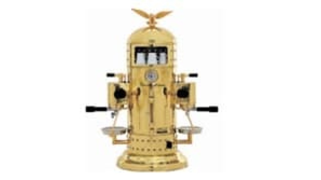 Кофемашина традиционная двухрожковая, полуавтомат предусматривает ручную дозацию, автоуровень воды, подачу пара и подачу кипятка. Остановка производится вручную, путем нажатия кнопки «stop». Объем бойлера - 7,6л. Цвет корпуса - латунь. Кофемашина имеет вертикальную форму. На верхушке находится фигурка орла с раскинутыми крыльями. Под «куполом» располагается подогреватель для чашек. Машина имеет манометр с двойной шкалой, клапан горячей воды, клапан пара, фильтродержатель. Дизайн основывается на текстуре, полученной в результате ударов молотка (вручную), что создает легкий эффект перламутра. Стильный старинный дизайн подойдет к современному или классическому интерьеру.