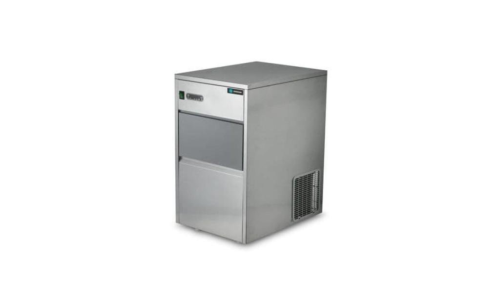 398 × 542 × 682 мм; 220 В; 0,24 кВт; 26 кг; пальчикового льда за сутки; цикл — 16 пальчиков за 17 минут; размер пальчика: ⌀28 × 40 мм; бункер — 7 кг; воздушное охлаждение; подключение к водопроводу; корпус из нержавеющей стали.