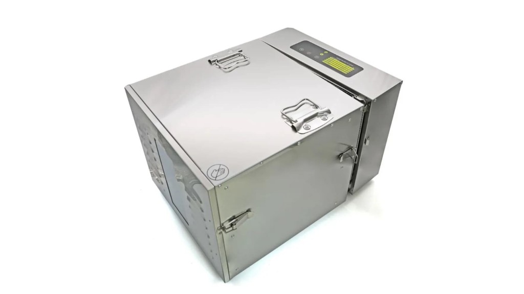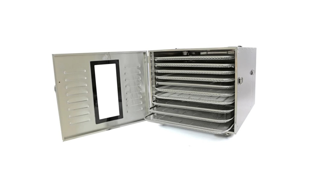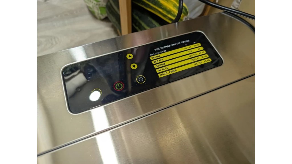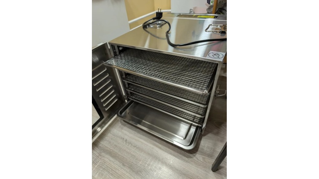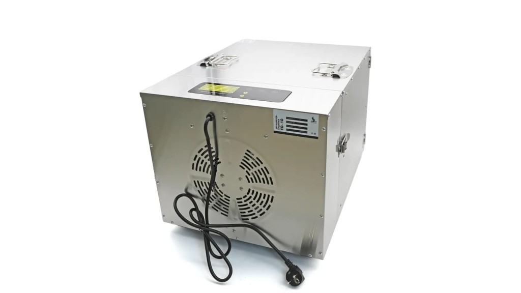 545 × 420 × 380 мм; 220 В; 1 кВт; 15 кг; сенсорная панель управления; 10 уровней (30 мм между уровнями); размер решеток 396 × 396 мм; температурный режим: 20…90 °C; таймер до 24 ч; уровень шума: 50 dB; дверь со стеклянным смотровым окном; корпус и решётки из нержавеющей стали.