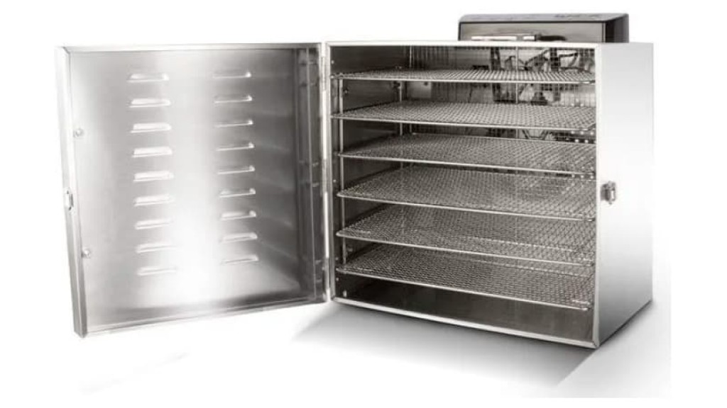 550 × 425 × 375 мм; 220 В; 0,4 кВт; 15 кг; электронная панель управления; 10 уровней (46 мм между уровнями); размер решеток 385 × 285 мм; температурный режим: 30…90 °C; таймер до 15 ч; уровень шума: 45 дБ; глухая дверь; корпус и решётки из нержавеющей стали.
