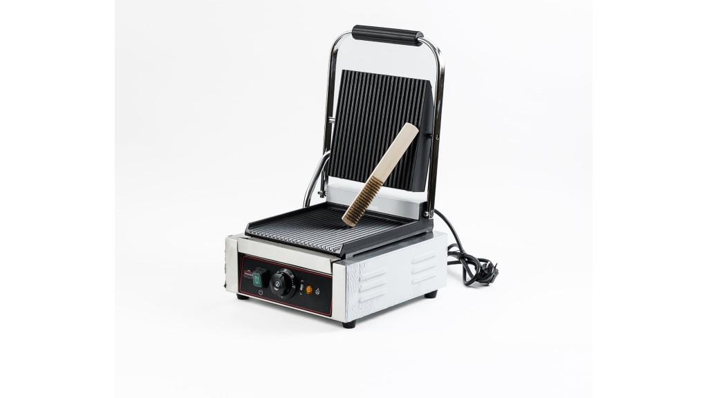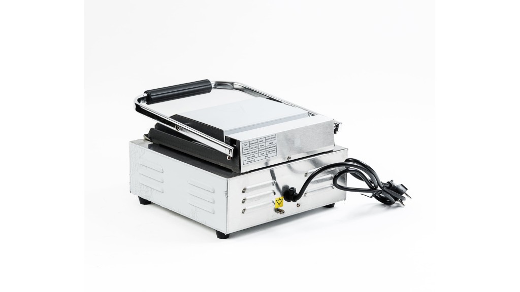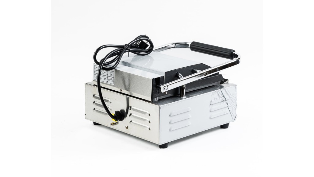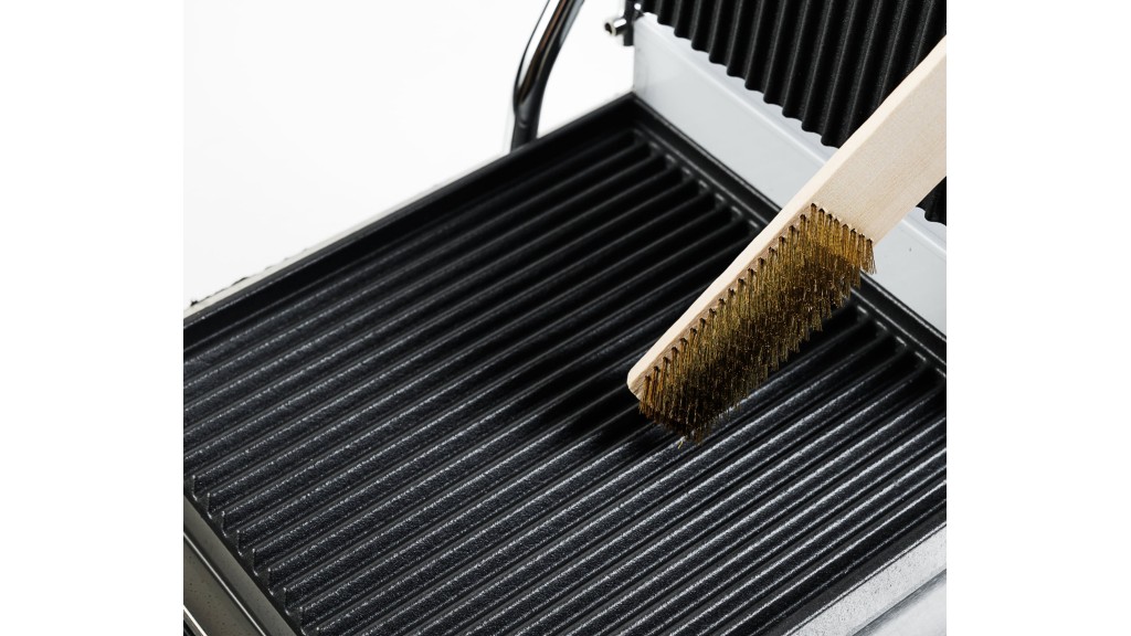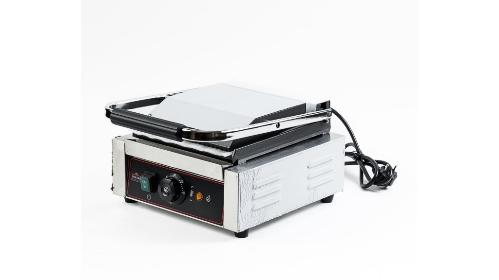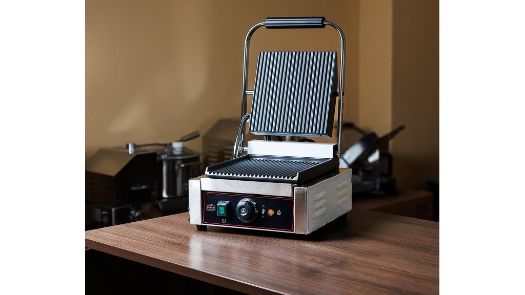 Одна зона нагрева; рифлёные чугунные верхняя и нижняя рабочие поверхности; 220 В; 1,8 кВт; 305 × 400 × 210 мм; 12,4 кг.