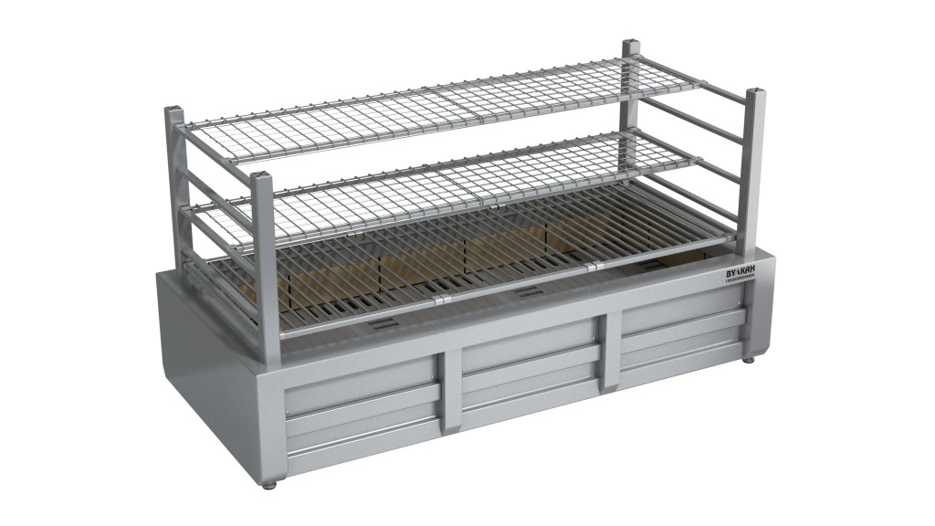 Настольный; горизонтальный; три уровня решёток; выдвижные зольники; огнеупорный камень; 1497 × 600 × 775 (с решётками) мм; габариты мангала: 1334 × 375 × 138 мм.